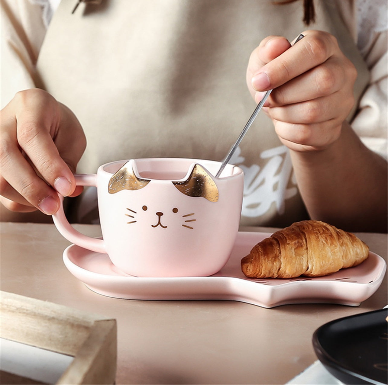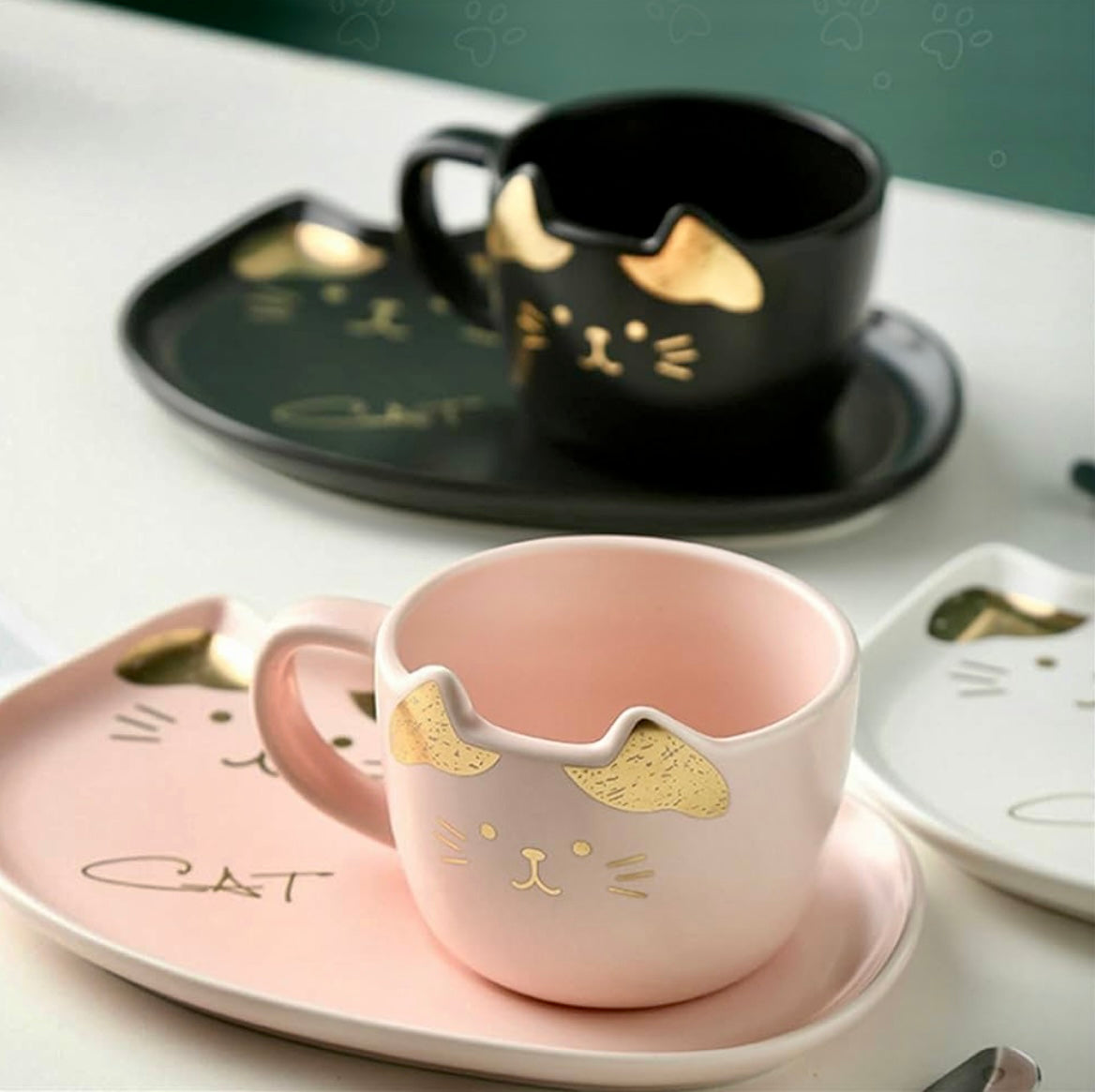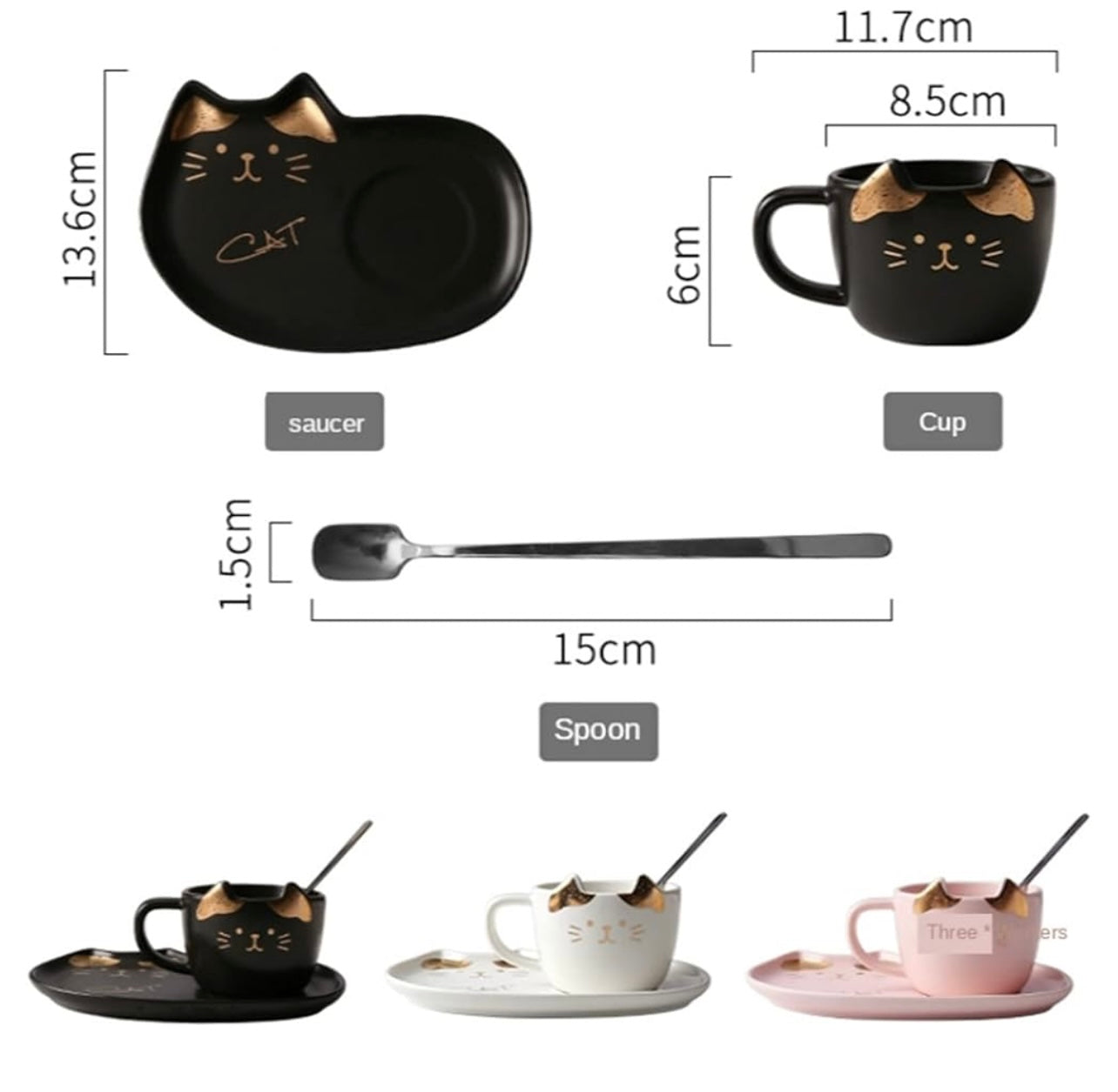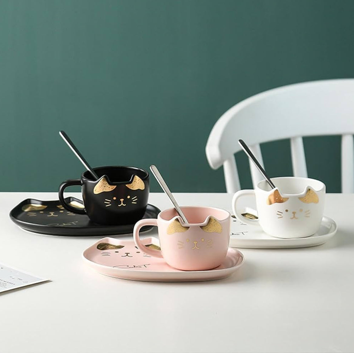 Ett snyggt set med 3 delar i keramik -med kopp, fat och sked, som har ett dekorativt kattmotiv i tre färger med gulddekor. Det är en perfekt present till dig eller kompisen som älskar katter!